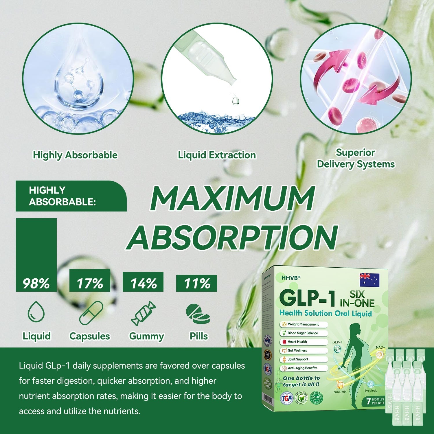 GLP-1 SIX-IN-ONE Health Solution Oral Liquid was developed by a team of over 30 experts in international endocrinology and diabetology after more than 3 years of research. It combines Tirzepatide with powerful herbal ingredients to boost metabolism, accelerate fat burning, and support digestive and lymphatic health. This oral solution has been approved by the Australia Food and Drug Administration (TGA) for its safety and efficacy, offering a scientifically backed solution for weight loss and overall wellness.